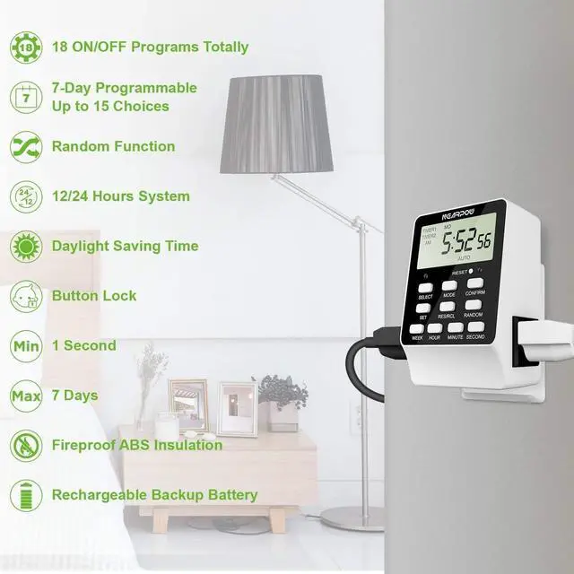 Multifunctional: 12/24 Hours System to show AM/PM conveniently. Daylight Saving Time just one step. Random Vacation Mode to make your home look lived in even when youre away, thus protecting your home from thieves. Child Lock Function to protect saved programs