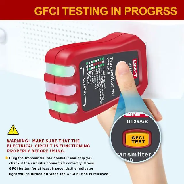 Three-pin plug Transmitter+GFCI outlet tester Connecting to North-American-style grounded electrical outlets.Transmitter incorporates a GFCI outlet tester to inspect the wiring condition at the electrical outlet and test GFCI devices.