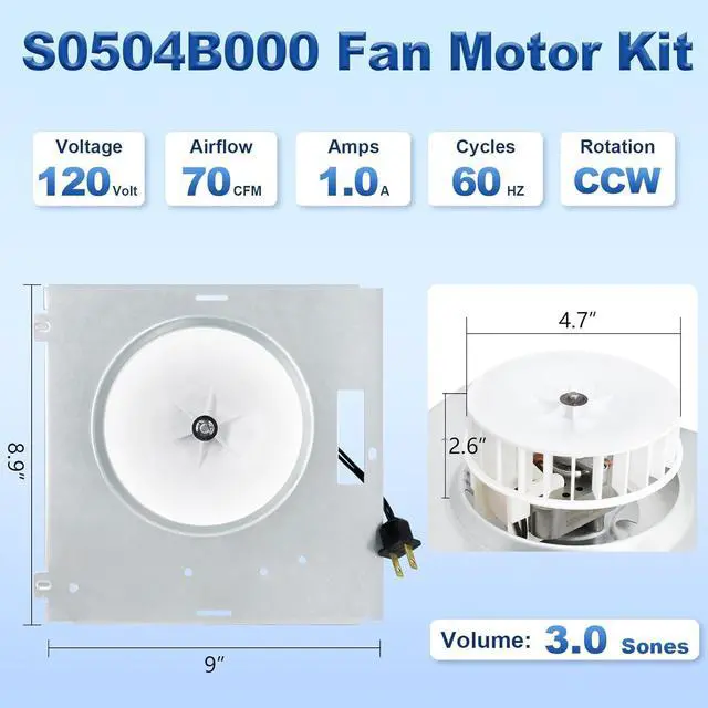 Upgrade your ventilation system: 70 CFM, Use our S0504B000 exhaust fan motor assembly to effectively and quickly expel the damp air and odors in the bathroom, quickly eliminate the fog on the mirror surface, ensure a fresh, well-ventilated and dry environment, improve the comfort after bathing and the overall indoor air quality