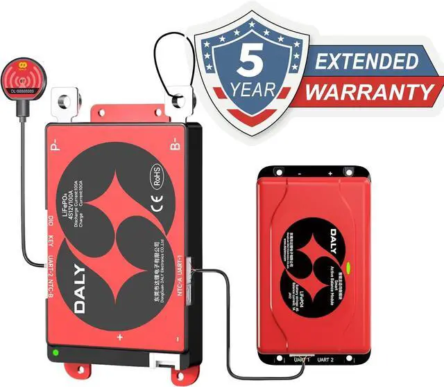 5-YEAR WARRANTY. Packing list: 4S 12V 100 Amps Smart BMS ×1, 1A 4S Smart Active Balancer×1, B-P-Output line ×1,BT dongle ×2, sampling cable ×1, NTC ×1, manual ×1. Easy to install - everything you need for setup and operation. Certifications: ISO/FCC/RoHS/PSE/CE approved.