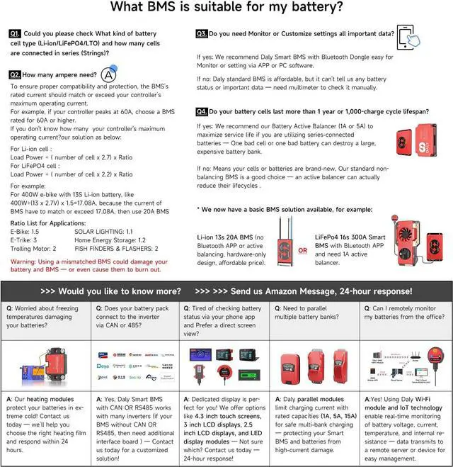 DALY BMS WITH 1A SMART ACTIVE BALANCER: Can be controlled by one app, simplifying management without switching, and it enables faster cell balancing, less heat generation, higher energy efficiency, and increased system runtime. Our active balance BMS solutions are designed to be simple and be cost-effective.