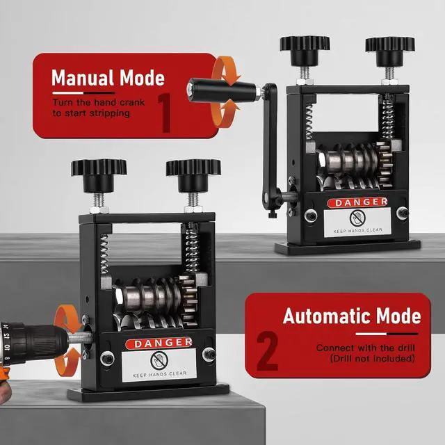 Dual Operation ModesEnjoy the convenience of switching between manual and automatic modes, this wire stripper tool lets you choose the best option for your needs, when using a hand crank, simply attach the hand crank and turn it. When using the electric drill drive, you can remove the hand crank, attach it to the electric drill, and then start the drill for automatic wire stripping!