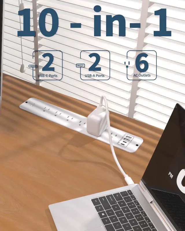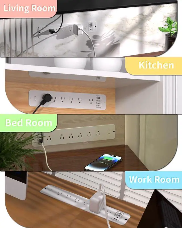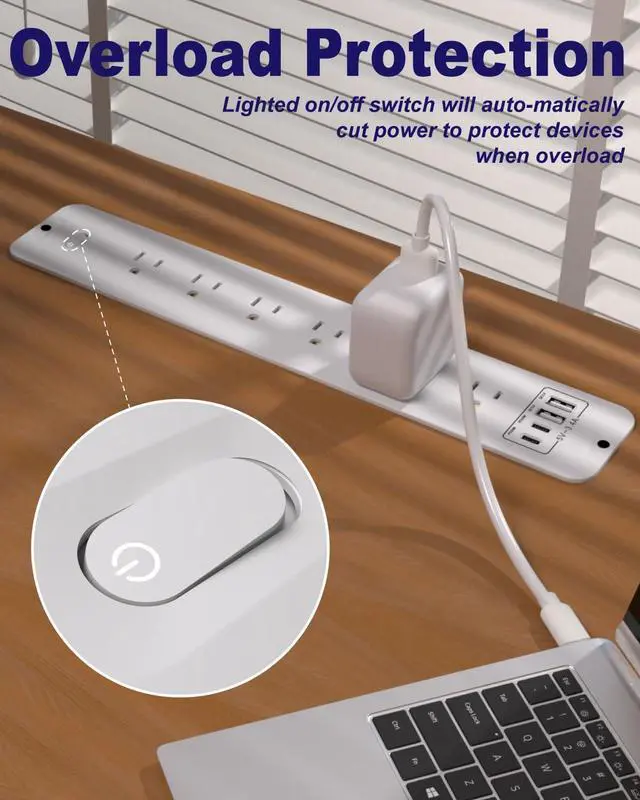 Flush Mount Power StripOnly 0.1" above desk surface (cutout size: 13.62"L x 2.5"W x 1.5"D). Fits most desks/workbenchesTwo Screws Can Hides Rough EdgesPerfect for hidden charging stations & clutter-free workspaces.Hides cords for a clutter-free workspace