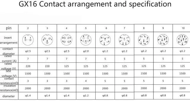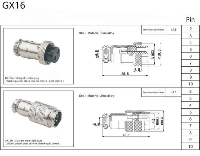 [GX16 8 Pin Thread Aviation Plug]: GX16 8 Pin cable and GX16 8 Pin connector aviation is made of metal and hard plastic; Shell material of GX16 8 Pin male female cable is Zinc Alloy; Connector pins material: fine copper silver plating; The GX16 8 Pin cable is used widely