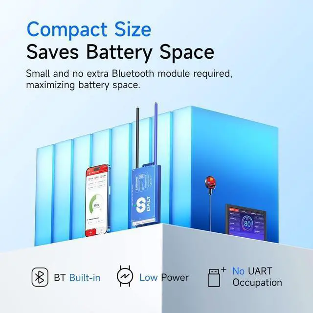 Battery Management System: Manage your battery easily with Android or iOS mobile app. Bluetooth connectivity allows you to monitor status, adjust settings and control charge/discharge from your device.