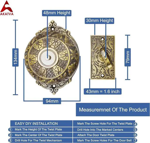 EASY TO INSTALL The mechanical doorbell for home requires no electrical wiring or batteries simply follow the instructions for DIY installation and fix the vintage doorbell for home with the included screws (comes with 1 extra) without any hassle! This doorbell (brass) can be used at home, offices, hotels, resorts, and more (133mm x 93mm x 45mm)!