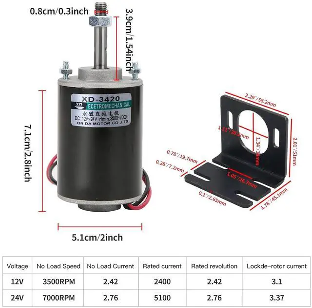 Motor Specification- Rated power:30W; Rated voltage: 12V-24V both suitable; Rated speed: 3500RPM(12V), 7000RPM(24V); Amperage: 0.5A; Output shaft length: 43mm/1.69inch; Torque: 1kgf.cm(12V), 2kgf.cm(24V).