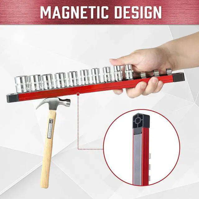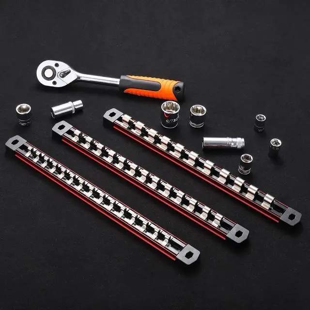 Magnetic Design: The powerful magnet strip of the socket organizer rail enables vertical or horizontal mounting on metal surfaces, while the smooth built-in groove simplifies clip movement and socket organization.