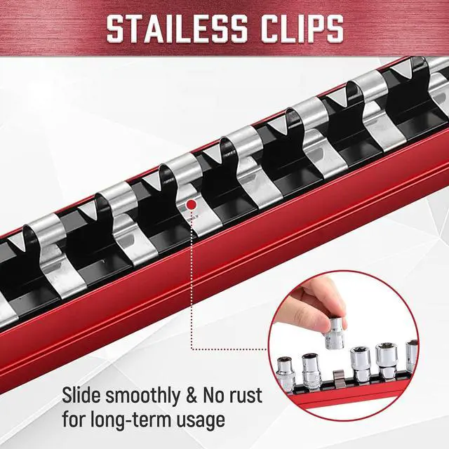 Firmly Secure Sockets: The inverted U-shape clips are detachable from the rail and feature stainless steel material that ensures long-term usage life without rust, they can hold the sockets firmly without losing, which will bring you the convenience of taking socket holders to any workshop.
