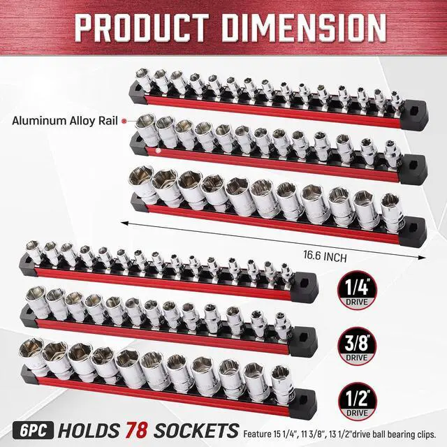 Product Size: The 6-piece socket rail organizer set features lengths of 13.5-inch and 22 1/2", 30 1/4" and 26 3/8" bearing clips, holding up to 78 pieces of sockets totally on the socket holder.
