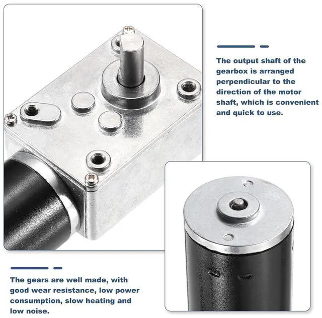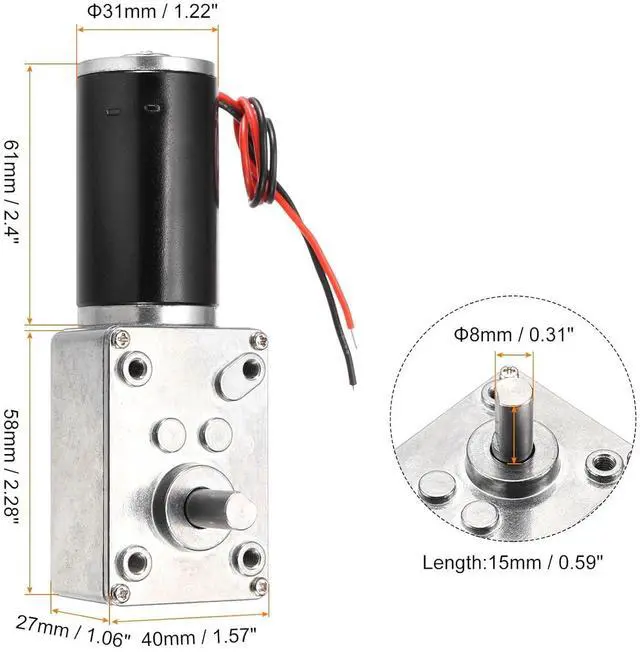 Rated Voltage: DC 12V; No-Load Output Speed : 40±10% RPM; Reduction Ratio: 1:200; Box Shaft Size: 8 x 15mm/ 0.31inch x 0.59inch(D*L); Motor Size: 60 x 31mm / 2.36inch x 1.22inch(L*W); Gear Box Size: 58 x 40 x 27mm/ 2.28inch x 1.57inch x 1.06inch(L*W*H); Total Size: 115 x 40 x 51mm / 4.5inch x 1.57inchx 2inch(L*W*H); Package Content: 1 Pack x Worm Geared Motor