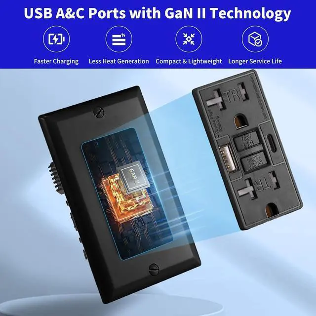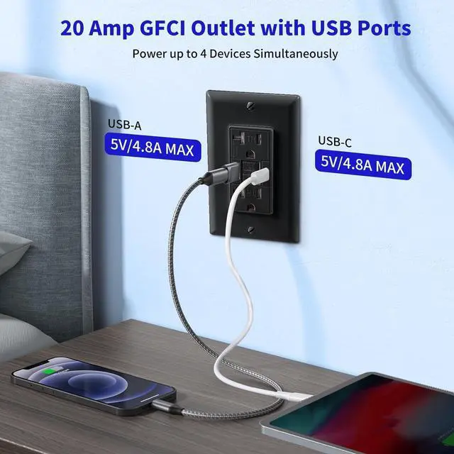 With USB Type A&CThe tamper-resistant 20 Amp GFCI power outlet with built-in USB type A&C port and 4.8A charging power gives you a quick and convenient charging port for your home.