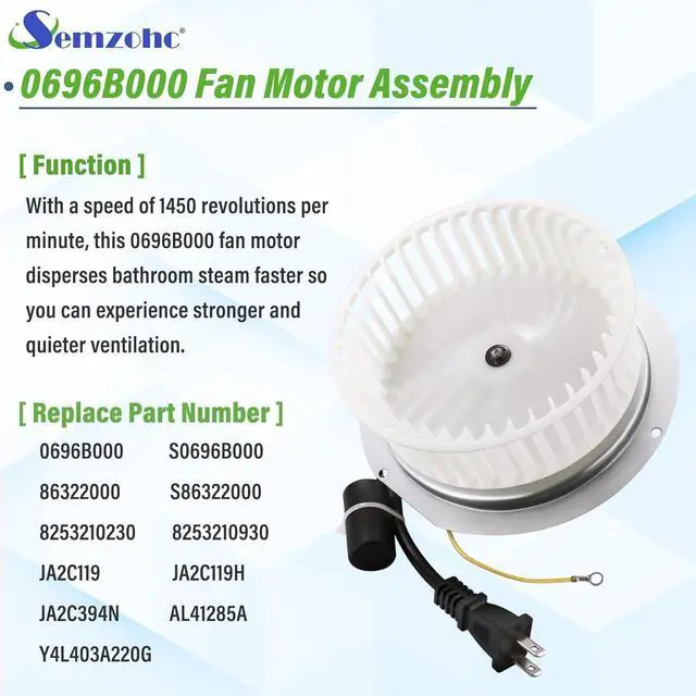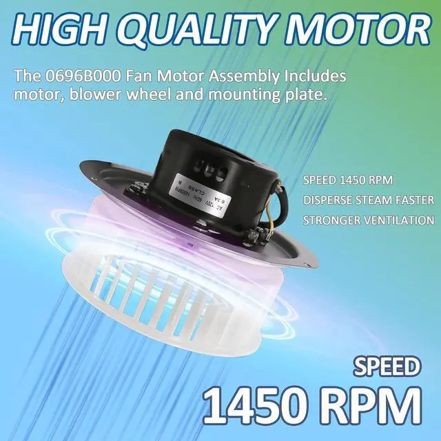 Details: The 0696B000 Bathroom Fan Motor Assembly includes motor, blower wheel and mounting plate. With a speed of 1450 revolutions per minute, this fan motor disperses bathroom steam faster so you can experience stronger and quieter ventilation