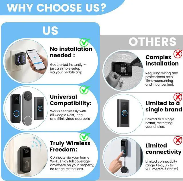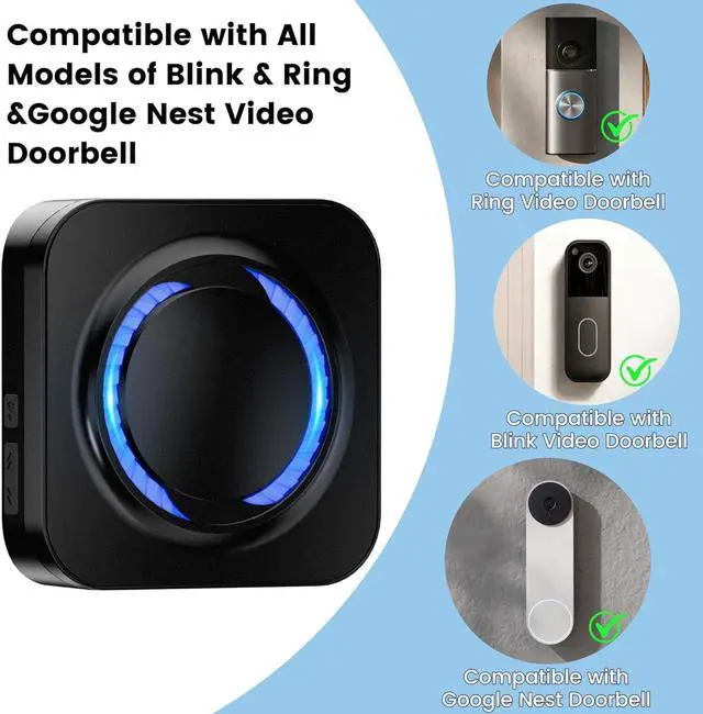 Wide Compatibility Compatible with all Blink, Ring, and Google Nest video doorbells. This wireless doorbell chime extender easily pairs with your main doorbell through the app no wiring or adapters required.
