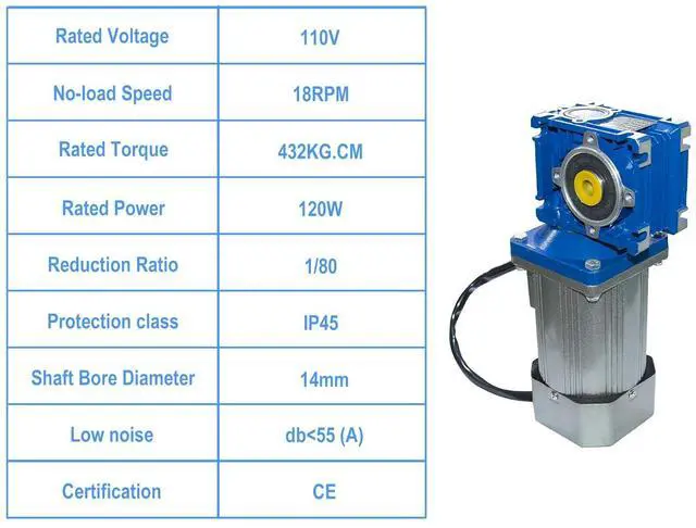 Product SpecsThe 120W Electric Motor with 1:80 Reduction Ratio, 345kg.cm Max Torque, 14mm Output Shaft Diameter. With self-locking worm gear structure ensuring system stability, perfect for precision position control;