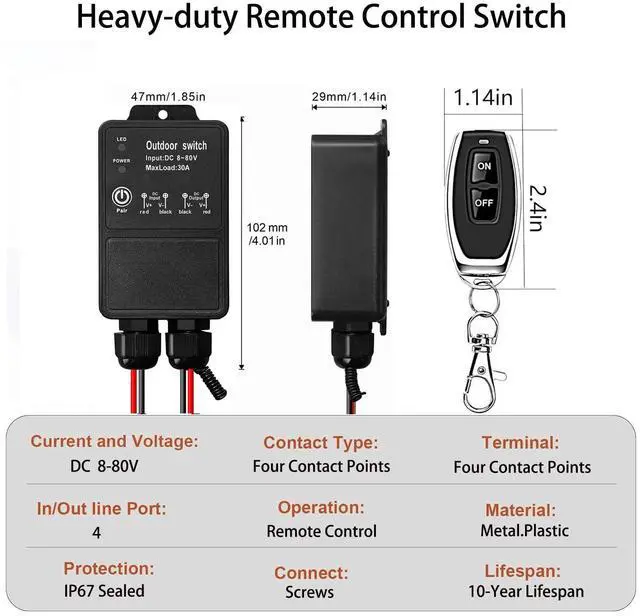Wide Voltage Compatibility & High Power ChargingSupport DC voltage from 8V to 80V, equipped with 30A heavy duty relay. Able to drive high-power devices such as water pumps, motors, dust collectors, fans, lighting systems and outdoor appliances with long-term stable performance.