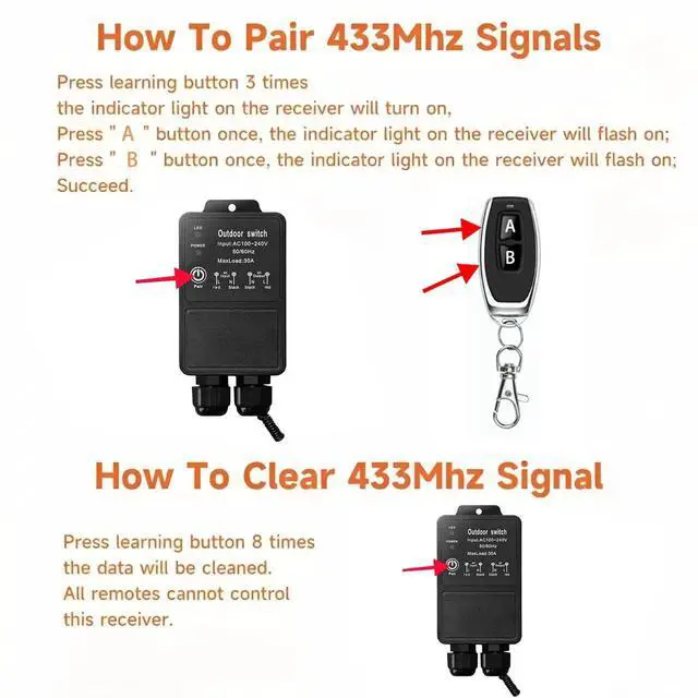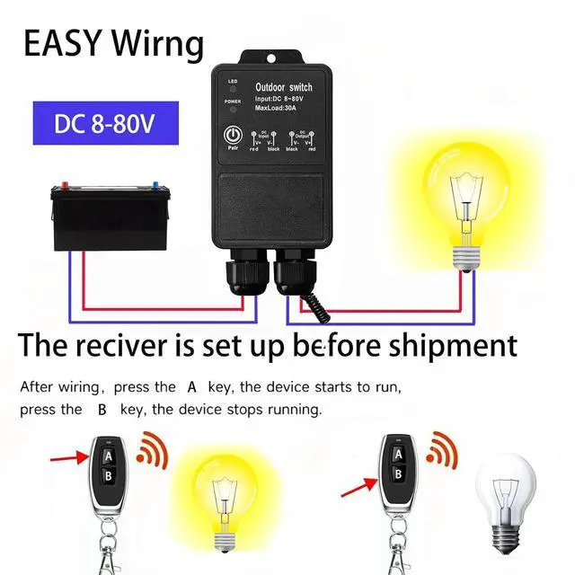 Easy Installation & Wide Applications Just plug the receiver between the power supply and the device to complete the installation. Supports on/off control for lights, water pumps, ventilation fans, motors, alarms, transformers, car accessories, spray pumps, bar lighting effects, security systems, DIY projects and more.
