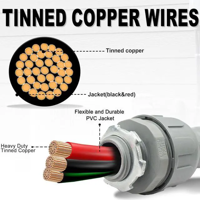 Complete Kit Included:Comes with: 8 AWG copper wires (3 conductors: red, black, green) 2 fittings (2 straight + 1 90-degree) with neoprene O-rings for a weatherproof, secure seal.