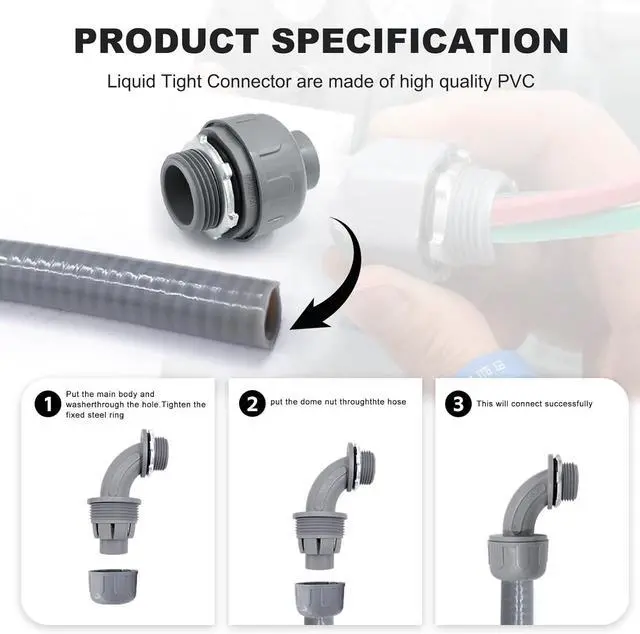 Heavy-Duty PVC Construction: Liquid-tight connectors are made of high-quality PVC, resistant to saltwater, oils, grease, weak acids, alcohol, and common solventsideal for demanding environments.