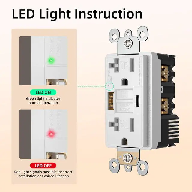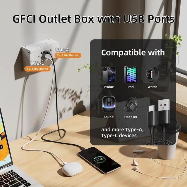 USB A & C Ports - The USB GFCI outlet box features both USB-A and USB-C ports with smart power distribution technology. The ports automatically disconnect during ground faults to protect sensitive devices