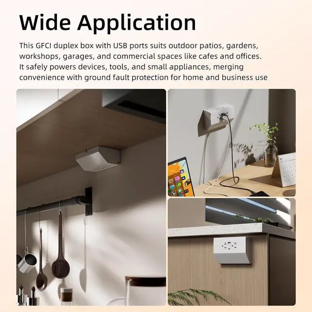 Wide Application - The electrical GFCI outlet box is ideal for commercial kitchens with its 20A/125V rating for high-power appliances. It's also commonly installed in bathrooms, garages, and outdoor entertainment areas where electrical safety is critical