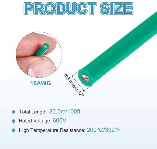 Package Content: 1pcs x Electrical Silicone Wire; Total Length: 30.5m/100ft; Outer Diameter: 3 mm/0.12 inch; Gauge: 16; Style: 1 Core of Multi-Strand Wiring; Rated Voltage: 600V; High Temperature Resistance: 200°/392