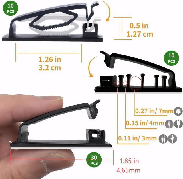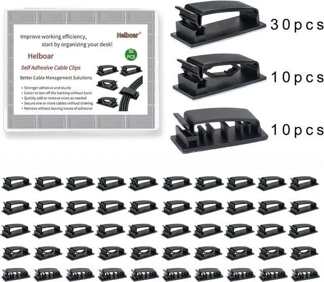 [Keep Organized]Helboar 50pcs unified appearance cable clips, three different functions of cable management, are designed with the simple snap lock. The self adhesive cord organizer kit will help those cluttered cables cords and wires around your desk, computer, cell phone, power strip, TV, nightstand be much organized, aesthetic and safer.