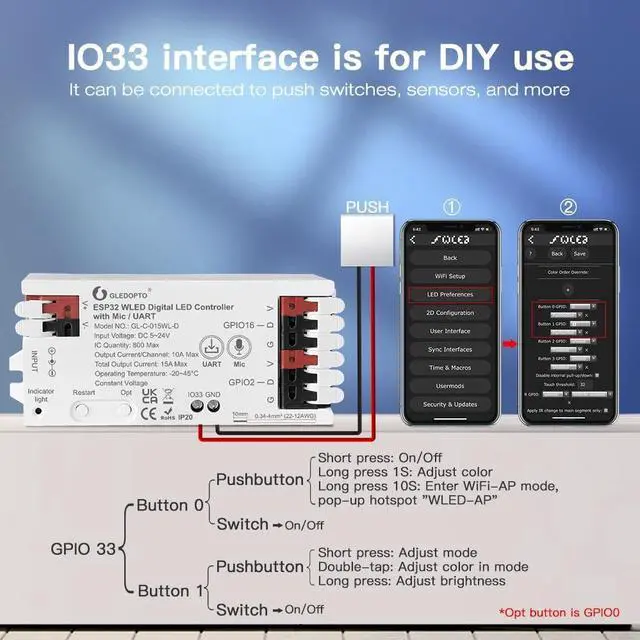 ESP32 WLED LED Controller Dynamic RGB IC IO33 DIY App Easy Wiring WS2811 WS2812 SK6812 TM1814 WS2813 WS2815 Strip Light