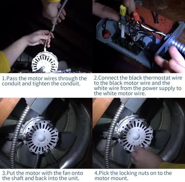 EASY INSTALLATION: Pass the motor wires through the conduit and tighten the conduit. Connect the black thermostat wire to the black motor wire and the white wire from the power supply to the white motor wire. Put the motor with the fan onto the shaft and back into the unit. Pick the locking nuts on to themotor mount.