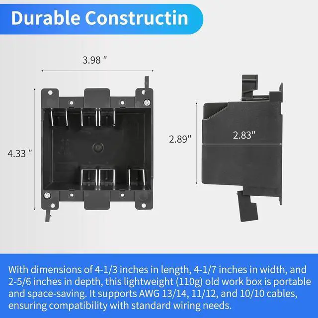 [Compact and Functional Design]: With dimensions of 4-1/3 inches in length, 4-1/7 inches in width, and 2-5/6 inches in depth, this lightweight (110g) old work box is portable and space-saving. It supports AWG 13/14, 11/12, and 10/10 cables, ensuring compatibility with standard wiring needs.