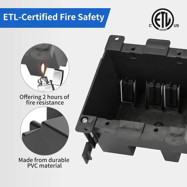 [ETL-Certified Fire Safety]: This 2-gang old work electrical box meets rigorous ETL standards, offering 2 hours of fire resistance. Made from durable PVC material, it delivers reliable performance to help protect your home and family from fire hazards.