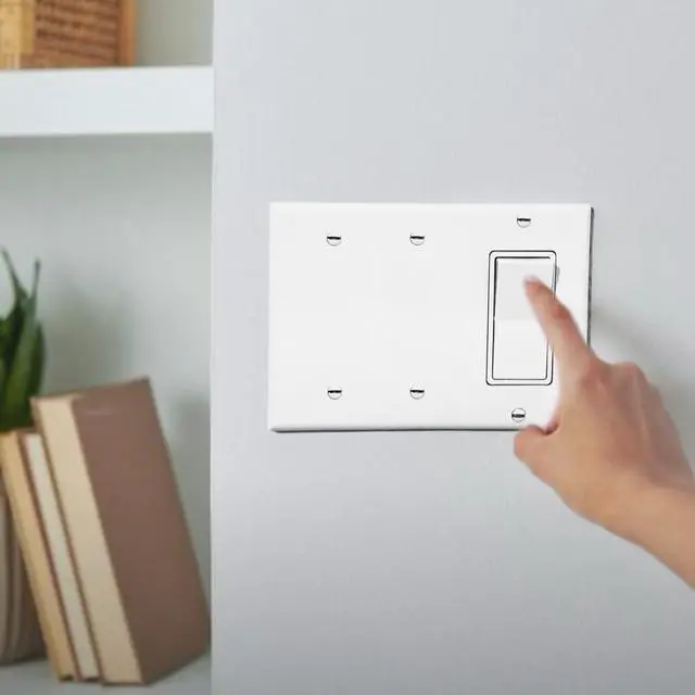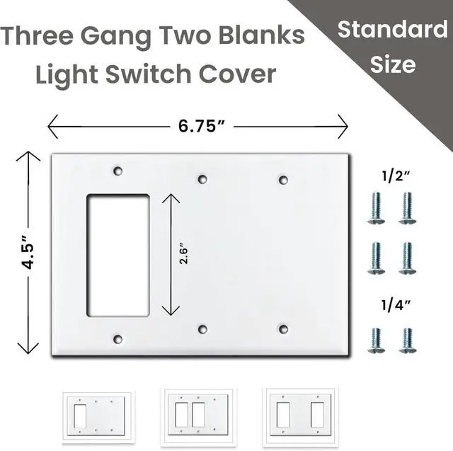 [BLANK COVER FOR UNUSED SWITCHES] 3-gang switch plate, features a blank cover for two of the three switch openings, allowing you to hide unused switches for a cleaner appearance.