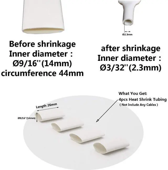 6:1 SHRINK RATIO- Super Heat Shrink Tubing12pcs, white.Length 26mm,Inner diameter: Ø9/16"(14mm), after shrinkage:Ø3/32"(2.3mm).makes a tight sealLow shrinkage temperature, shrinking in just a few secondstarting Shrinkage Temp: +70°CFull Shrinkage Temp: +105°CIf ordinary 2:1, 3:1 Heat Shrink Tubing can not be solved. Please choose this one