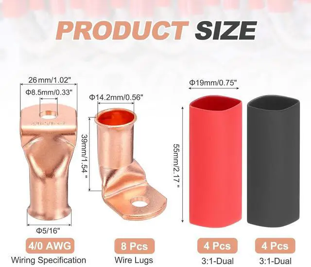 This Copper Cable Lug is made of copper and is installed using crimp method. It has a wiring specification of 4/0 Awg, with a terminal hole diameter of 5/16 inches and a head inner diameter of 14.2mm/0.56 inch. The total size is 39x26x8.5mm/1.54x1.02x0.33 inch and comes with 8 wire lugs including 8 3:1 heat shrink tubes (4 black + 4 red). The 3:1 heat shrink tubing size is 19.0mmx55mm/0.75x2.17 inch