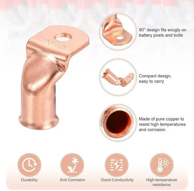 90-degree bent copper lugs are made of pure copper to resist high temperatures and corrosion, ensuring minimal resistance and maximum power transfer. The 90° design fits snugly on battery posts and bolts, and can be connected by crimping and welding, ensuring electrical components, batteries, and cables are safe. 3:1 adhesive heat shrink tubing seals the connection and has excellent insulation properties, protecting the connection from heat, dust, moisture, and corrosion.