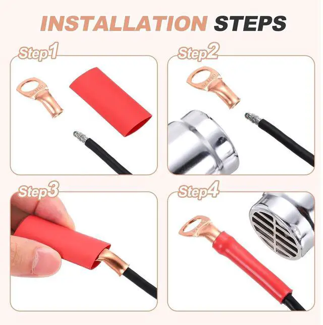 1.Crimp Tightly: Use a crimping tool to compress the lug barrel securely onto the wire.2.Seal with Tubing: Slide the heat shrink tube over the connection and apply heat (e.g., heat gun) until fully sealed.