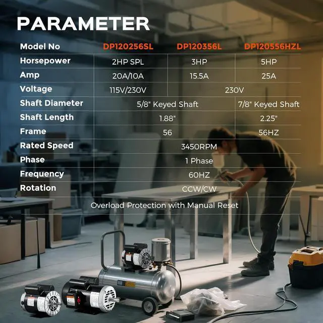 Air Compressor Motor: 2HP 3450 RPM, Single Phase, 115/230V, 20/10A Full Load Amps, CCW/CW Rotation, 56 Frame, 5/8" Keyed shaft, 1.88" Shaft length.
