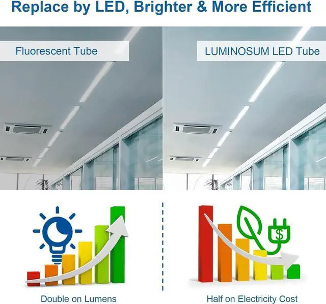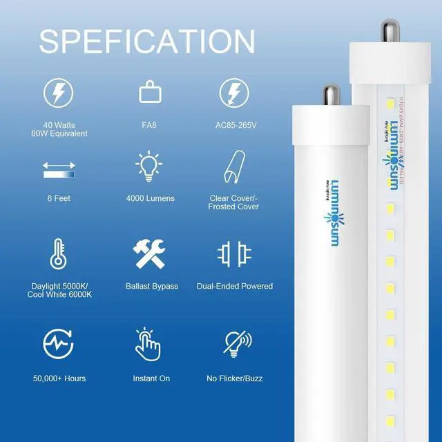 Energy Saving & Super BrightReplace traditional fluorescent bulbs with LUMINOSUM 8FT LED Tube Lightscut electricity costs significantly! 4000 lumens of soft, stable light with no flicker or buzz, ensuring clear, comfortable illumination for any space.