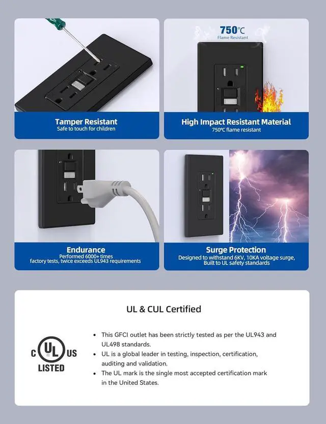 Durable and Ultra-Safe DesignBuilt with premium high-impact resistant thermoplastic materials. Endurance-tested over 6,000 timestwice the UL requirement. Features advanced safety features like 6kV surge protection, Reset-Disable, and Reversed Wiring Prevention to ensure long-lasting performance and maximum protection.Tamper-resistant shutter system prevents young children from inserting unwanted objects into the outlets.