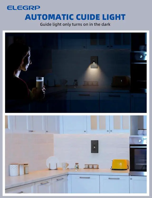 Make Nighttime Navigation AutomaticWith built-in night light, this GFCI outlet automatically turns light on in dark and off in daylight, delivers advanced safety and protection. Ideal for kitchens, bathrooms, hallways, stairs, nurseries, and more. Saves space by eliminating the need to use an outlet for a plug-in night light.