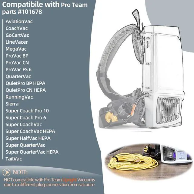 Compatibility: The replacement compatible with Pro team vacuum parts is designed specifically for Pro Team parts #101678, seamlessly integrating with your vacuum, providing a perfect fit and eliminating compatibility concerns. Compatible with Pro Team AviationVac, LinerVacer HEPA, LineVacer ULPA, MegaVac, ProVac CN, ProVac FS 6, QuietPro BP, QuietPro CN HEPA, RunningVac, Super Coach Pro 10, Super Coach Pro 6, Super CoachVac, Super HalfVac Pro, Super QuarterVac vacuums. (Please note this cord is NOT compatible with Pro Team Upright Vacuums due to a different plug connection from vacuum.)