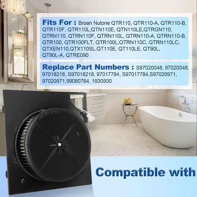 Compatible with models:Fits For Broan Nutone Bathroom Exhaust Fan QTR100, QTR110, QTR110-A, QTR110-B, QTR110F, QTR110L,QTR100FLT, QTR100L, QTN110E, QTN110LE, QTRN110, QTRN110F, QTRN110L, QTRN110-A, QTRN110-B, QTRN110C,QTRN110LC,QTRGN110, QTXEN110, QTX110SL, QT110E, QT110LE, QT90L, QT90L-A, QTRE090