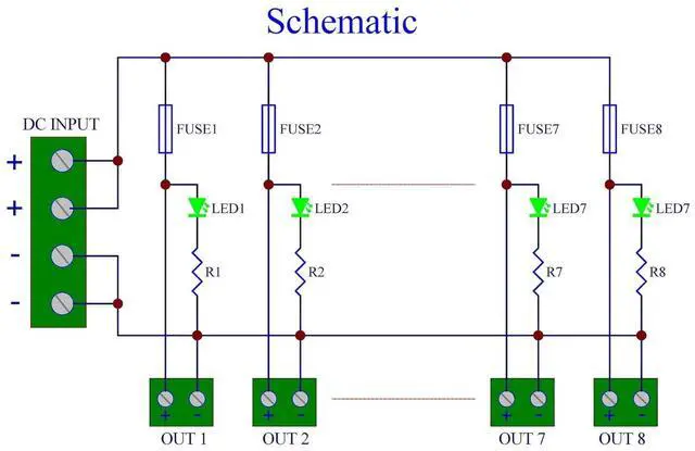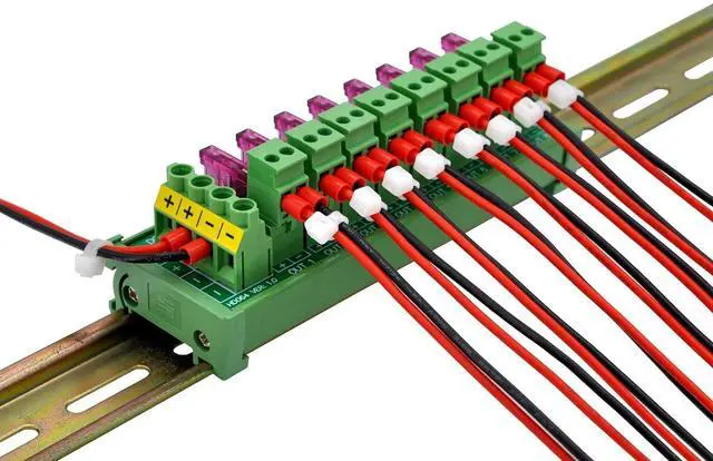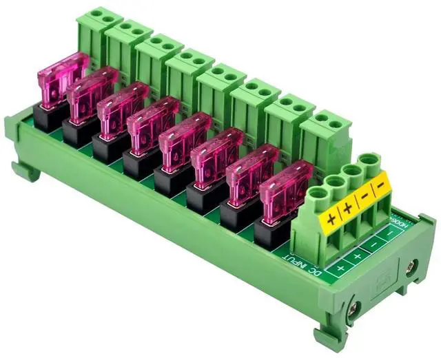 Pluggable fuse holder, can support medium blade ATO / ATC fuse. Each output channel has a green LED indicator, when the fuse is blown or pulled out, the LED indicator will be off.