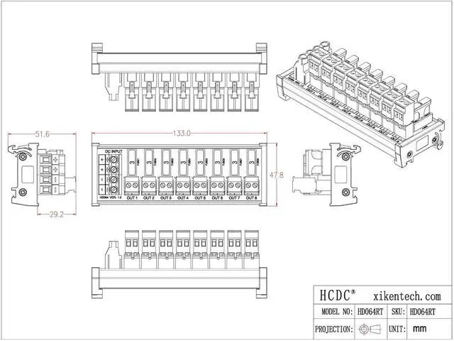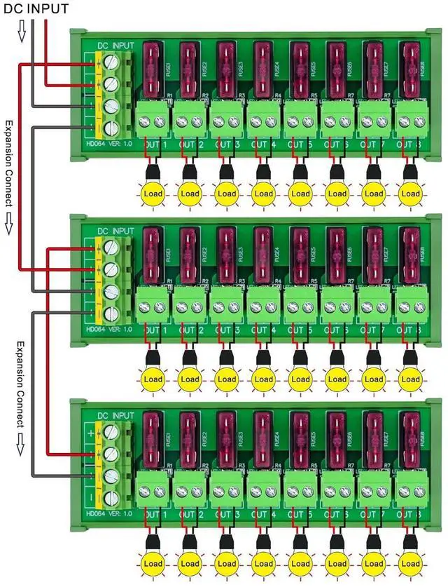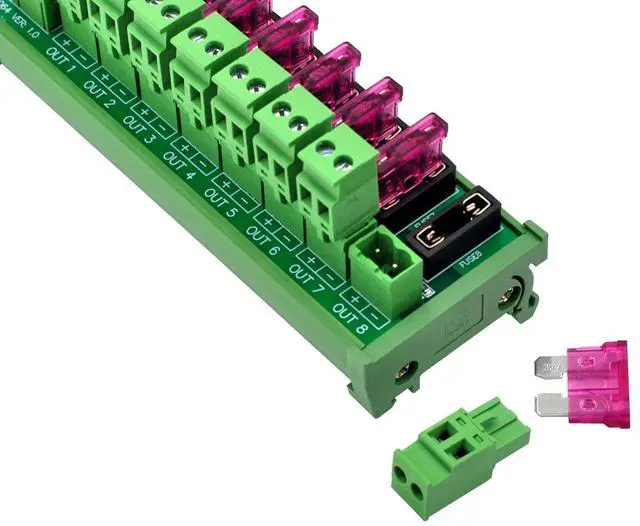 Output: 8 position pluggable side wiring terminal blocks. Maximum current 3 Amp for per position (the terminal highest working current can support up to 10 Amp, but factory pre-installed fuse value is 3 Amp, if you want more output current, please change the fuse). Pin pitch 5.08mm/0.2", wire size 28 - 12 AWG, stripping length 7mm, Metric M2.5 slotted screw.