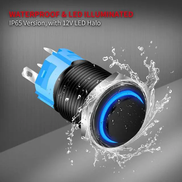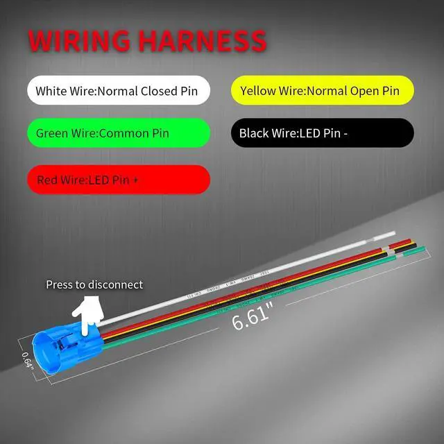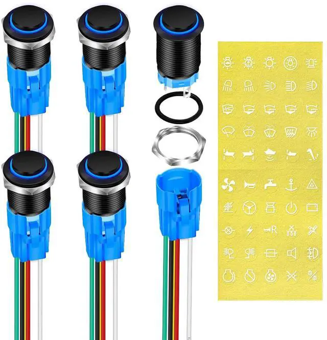 LED Push Button Switch, 5A 12VDC rating, with wiring harness. 16mm Pre Wired Pushbutton Switch require 5/8 Inch Panel Mounting Hole.