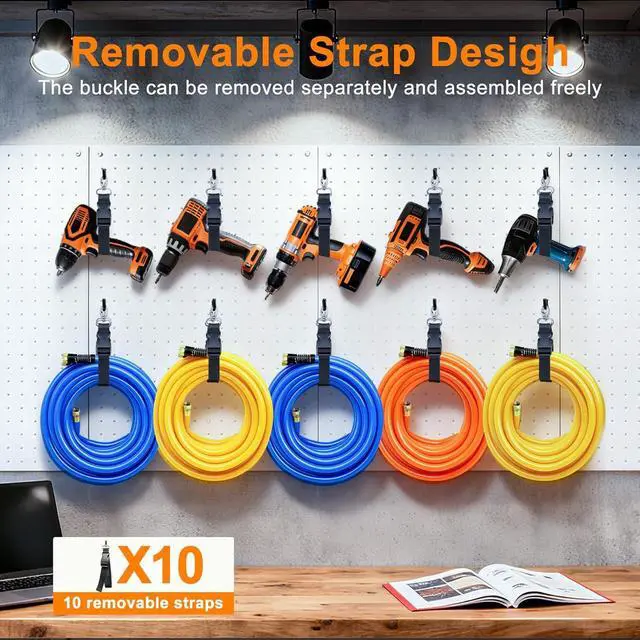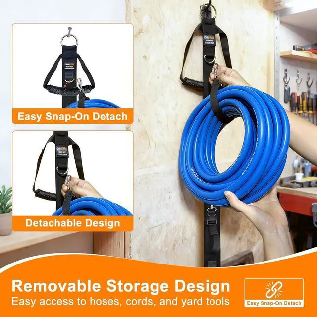 Unique Design: Our Hose Organizer have 5 Detachable Straps with D rings on the main strap for hanging the strap, 5 D rings are evenly spaced on the mian strap, these D-rings serve as convenient hanging points, allowing you to easily hang the entire organizer (or individual straps) on hooks, garage walls, or tool racks
