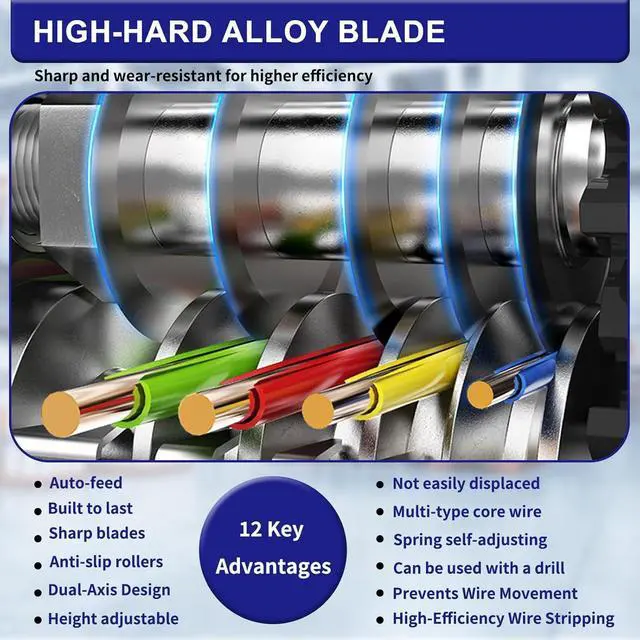 Easy to Operate: Equipped with sharp alloy steel blades for clean and precise cutting. Simply adjust the blade depth using the top knob, insert the wire, and turn the handle or connect a drill for instant stripping. (Note: Ensure both top knobs are adjusted to the same height before use).