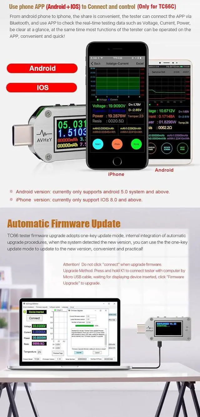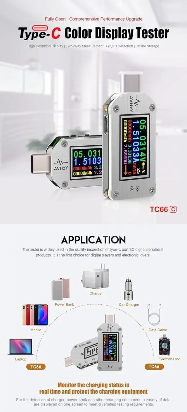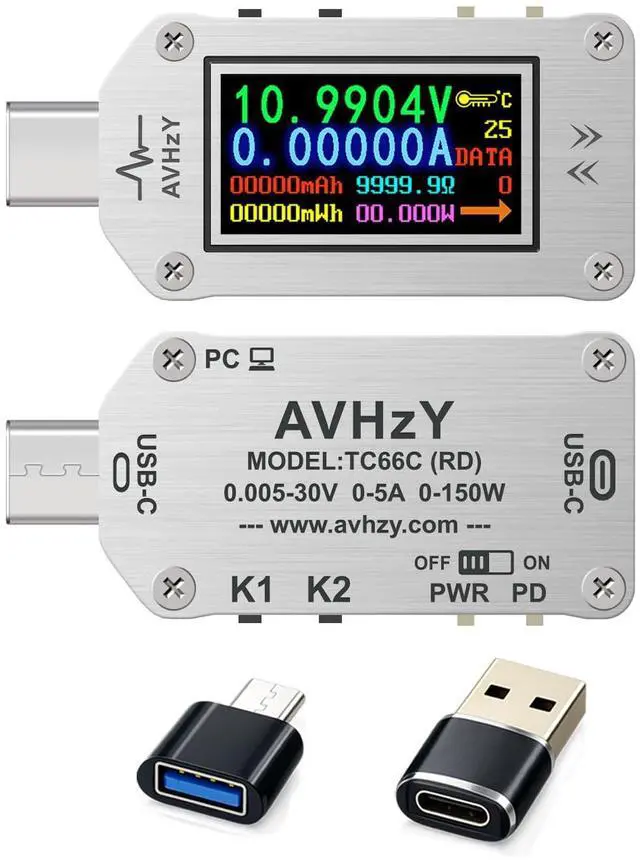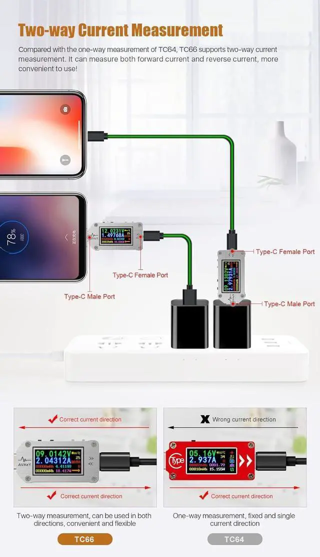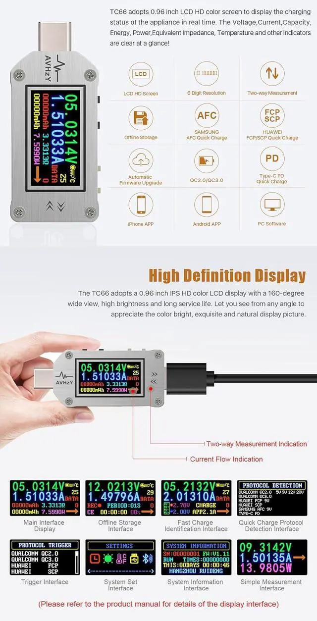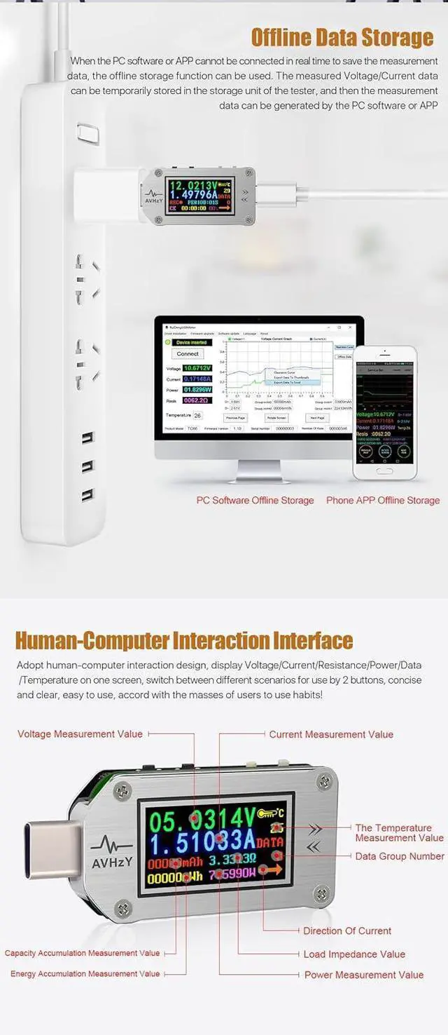 Support for two-way current flow passage Offline Data Storage, 10 Data Groups Show voltage/current/power/capacity/energy/resistance/temperature on a screen Compact design, 0.96 inch screen, easy to carry, does not take up much space