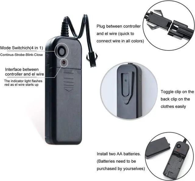 [Battery Controller 4 Modes] The glowing wire offers Continuous ON, strobe, blink, and OFF modes, providing 360-degree illumination by pressing the button on the battery pack.