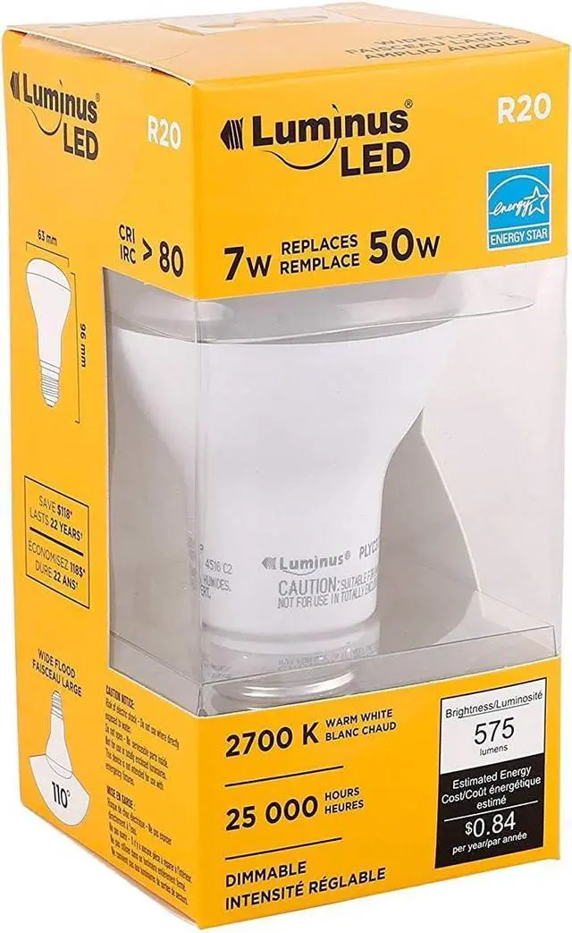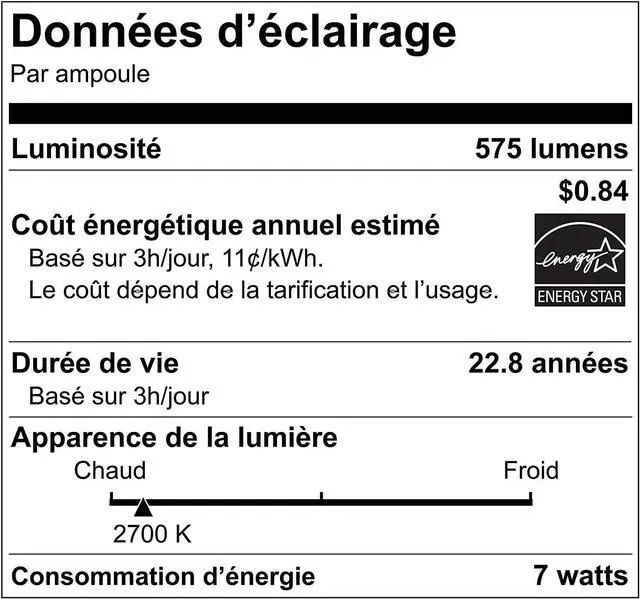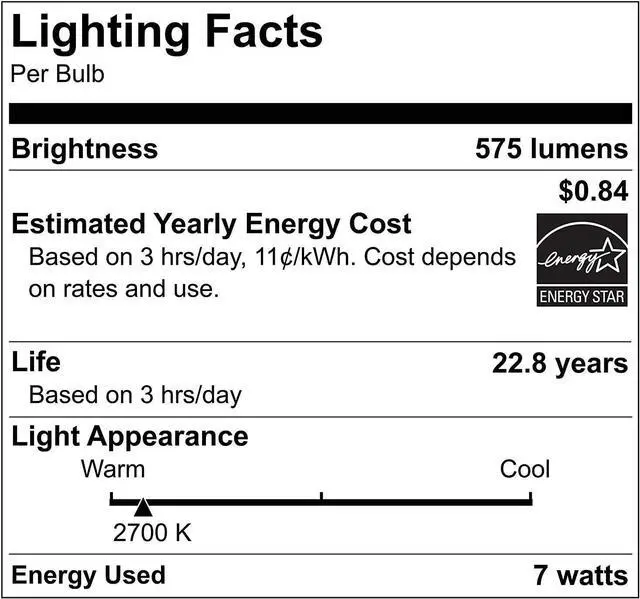 7W replaces 50W incandescent Warm White (2700k) and 575 Lumens of brightness Energy Star certified Lifespan of 22.8 years saving you $188.25 Beam angle of 110-Degree , typically used in recessed downlights